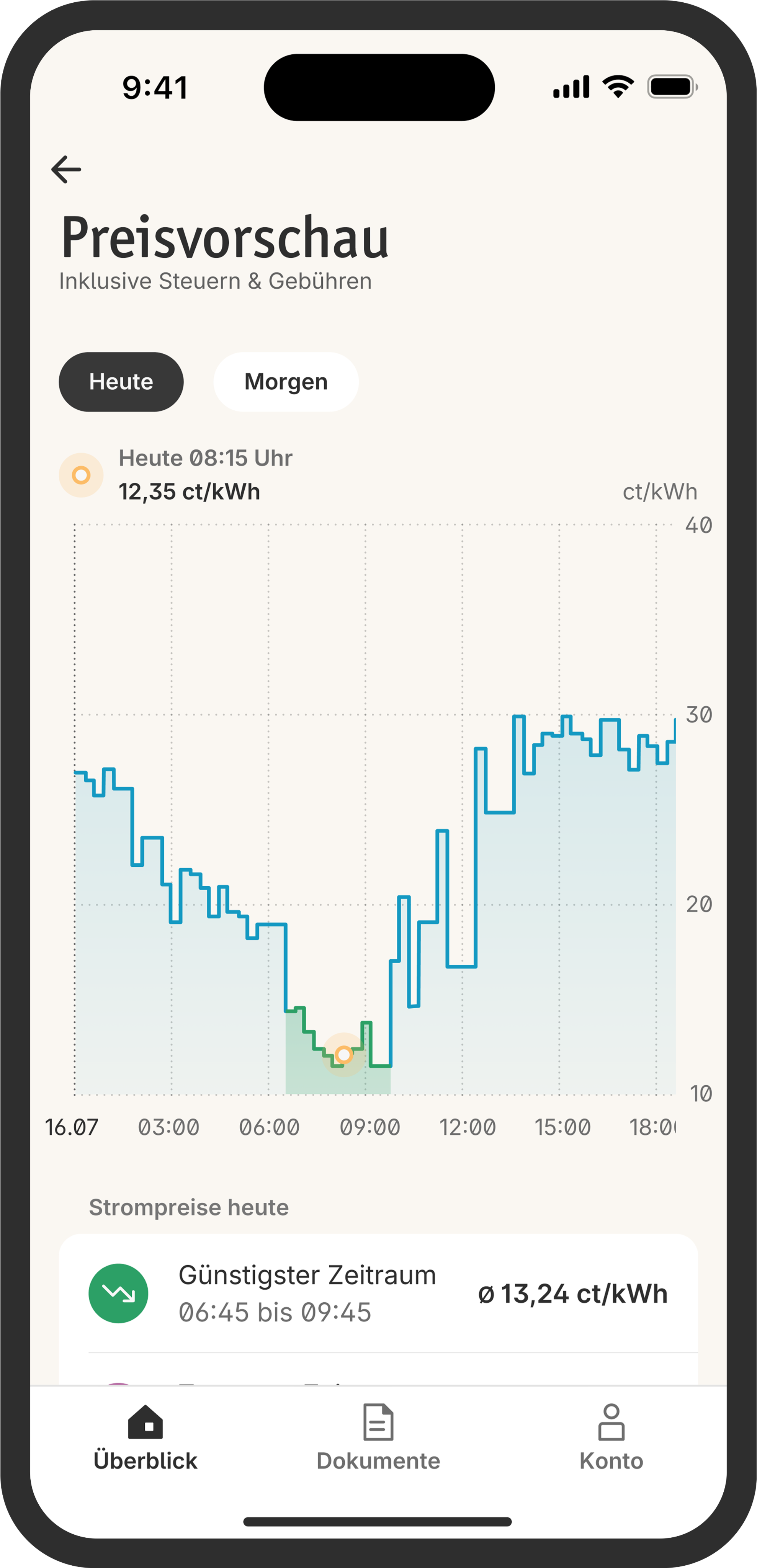 Checkt günstige Zeiten und spart Stromkosten.