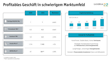 LichtBlick zieht eine positive Bilanz des Geschäftsjahres 2021. Nach dem starken Wachstumsschub im Jahr 2020 konnte das Unternehmen sein Geschäft konsolidieren. Der Umsatz stieg leicht auf 1,14 Milliarden Euro (2020: 1,11), die Zahl der Energieverträge mit Haushalten und Unternehmen blieb mit rund einer Million stabil. Der Gewinn vor Steuern und Abgaben (EBITDA) lag bei 60 Millionen Euro (2020: 47 Mio). „Wir haben die Herausforderungen durch die historisch hohen und enorm schwankenden Energiepreise bisher erfolgreich gemeistert. Mit unserer konsequenten Klimastrategie und unserem umsichtigen Energiehandel sind wir auch in unsicheren Zeiten ein glaubwürdiger und zuverlässiger Partner für unsere Kund*innen“, bilanziert CFO Tanja Schumann. Auch die ersten Monate des Jahres 2022 sind für LichtBlick erfolgreich verlaufen, das Unternehmen erwartet ein deutlich positives Jahresergebnis.